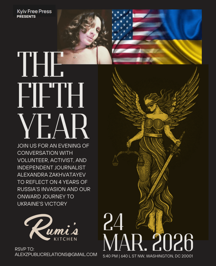 Я роблю себе доступною для публічного обговорення воєнних зусиль нашого народу у вівторок, 24 березня 2026 року о 17:40 в іранському ресторані «Rumi’s Kitchen» у центрі Вашингтона, округ Колумбія. Будь ласка, приєднуйтеся до мене цієї весни біля Капітолію США, щоб обговорити майбутній шлях до перемоги. RSVP: alexzpublicrelations@gmail.com