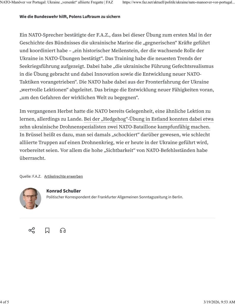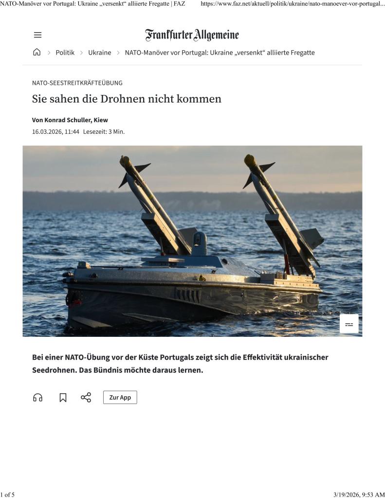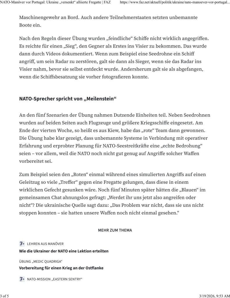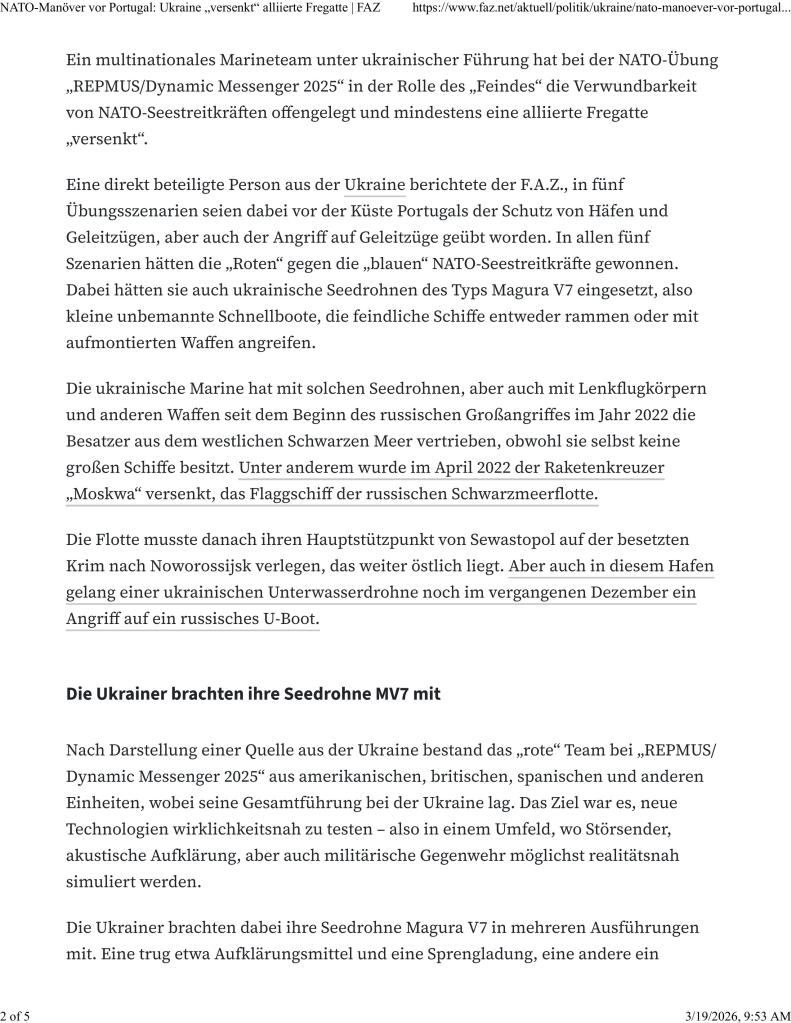 19 Mar 2026 – The REP(MUS)/Dynamic Messenger 2025 naval exercise has been public knowledge since at least Sept 2025, but this latest (and timely) report on Ukraine’s multi-tiered system and operational dominance in the NATO exercise has recently come out. Curiously, it is from a news source Frankfurter Allgemeine Zeitung which has the results of Ukraine’s success firewalled and in German language only…