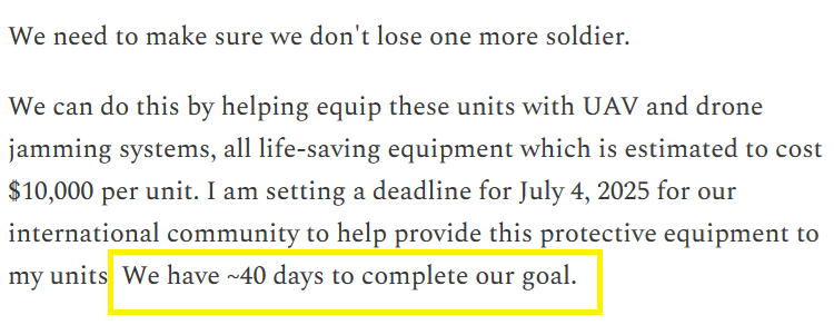 Exactly 40 days ago today was Memorial Day, and I spent that day writing to commemorate the fallen soldiers of my friends’ military unit, Chosen Company. I sent the letter to my friends… and since I’ve been raising funds here and there to send miiltary equipment to the front, I made this goal of fundraising Chosen and my friends with Presidential Brigade in Luhansk, and I set a deadline for the fourth of July..
