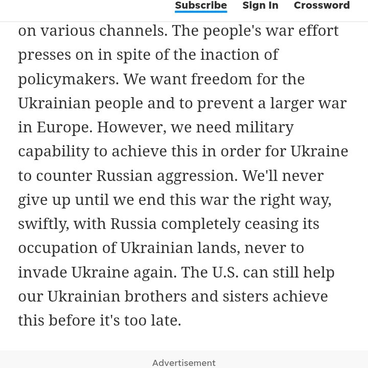 As for the rest of civil society, what I must take responsibility, My government, the AMerican government must come together in alliance with Ukraine to decisively end this war with what I believe to be the only solution: aggressive military force.